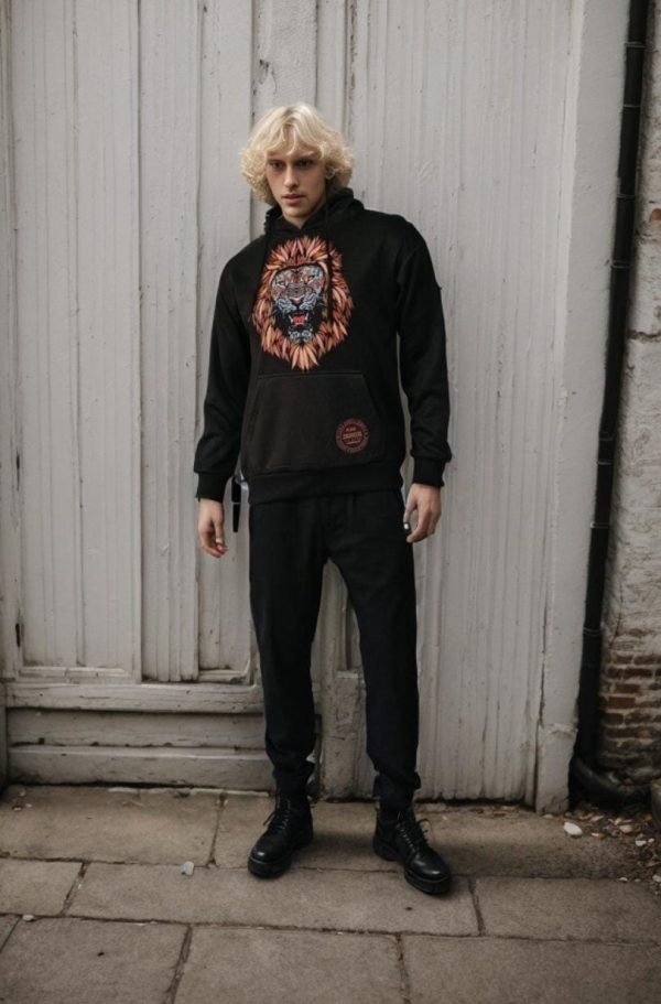 Felpa nera con cappuccio disegno leone